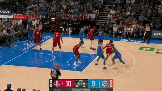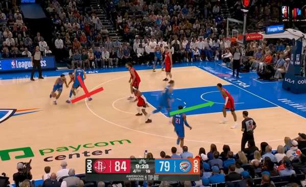 亚历山大和多尔特在弧顶做掩护,亚历山大吸引了申京和阿门的包夹,火箭防守阵型改变,立刻回传球,