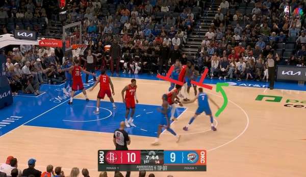 亚历山大发现火箭摆了一个2-3联防,于是分球给侧翼的多尔特,目的其实是改变火箭的防守阵型