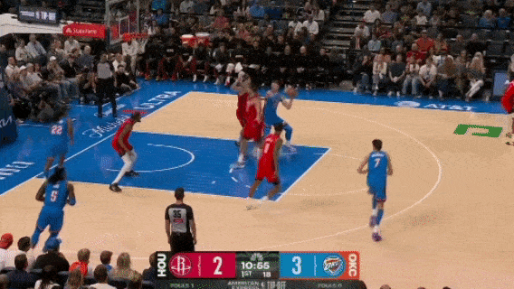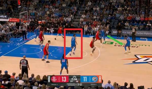 由于杜兰特并未被内切的华莱士带走,所以切特未获得直接三分出手的机会,于是他只能选择在罚球线附近单打,雷霆球员的站位,给了切特足够的区域进行单打。