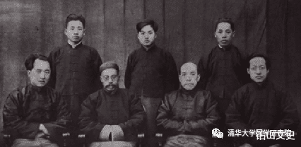 (前排左起:李济、王国维、梁启超、赵元任;后排左起:章昭煌、陆维钊、梁廷灿)