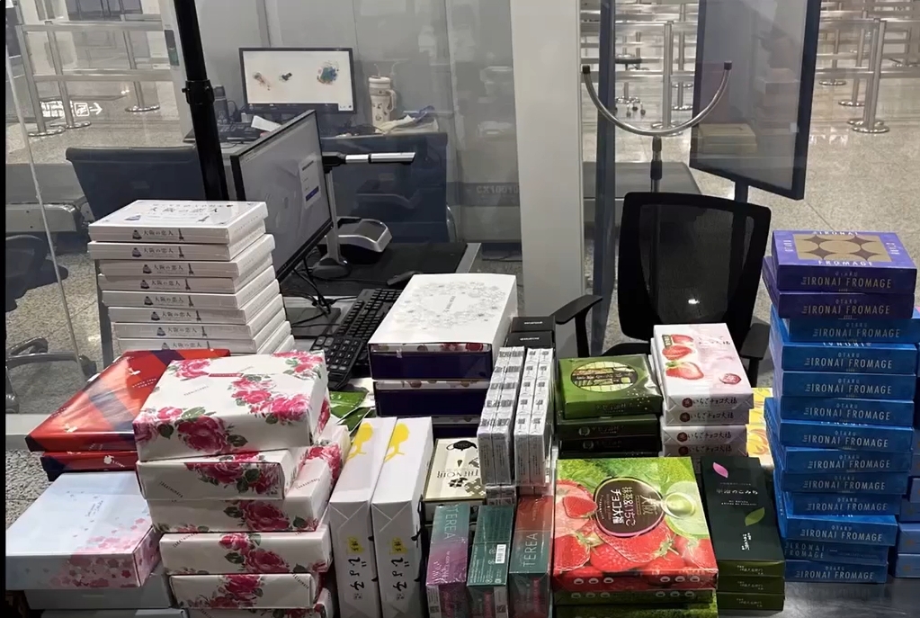 近日,南京禄口机场海关在旅检渠道查获多名旅客组团走私巧克力、点心等食品740盒以及52条香烟、17条电子烟入境。某日,海