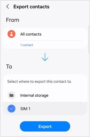 通过 SIM 卡将 Android 设备上的联系人导入 iPhone:在您的安卓手机上,打开“联系人”应用,找到“管理联系人”>“导入/导出”>“导出联系人”选项,选择您的 SIM 卡,然后点击“导出”。