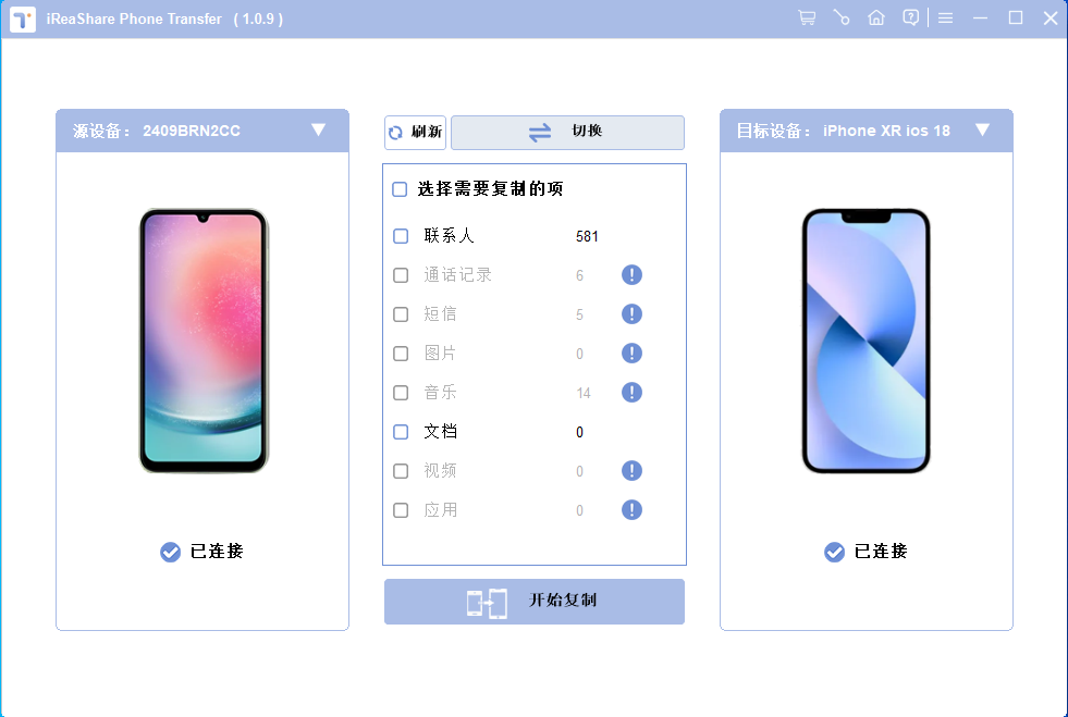 如果您的 iPhone 17 已设置完毕,并且您不想抹掉它, iReaShare Phone Transfer提供了一种便捷的方式来直接传输联系人。这款软件可以通过 USB 将您 Android 设备上的联系人复制到您的 iPhone 17 Pro Max/17 Pro/17/Air 或其他型号。传输的联系人不会覆盖目标设备上已有的联系人。