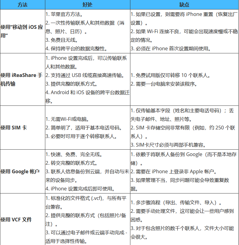 使用 iCloud 合并或删除重复联系人(您也可以使用 Cleaner for iPhone 等应用程序来辅助)。 如果使用 Google,Google 通讯录内置了重复联系人管理功能。 通过 iPhone 上的“通讯录”应用手动删除重复联系人。结论现在,有了这 5 种实用方法,您可以在设置过程中或设置完成后轻松地将联系人从 Android 手机传输到 iPhone。如果您想在设置完成后立即传输大量联系人, iReaShare Phone Transfer可能更适合您。它可以一次性传输所有联系人,包括电话号码、姓名、群组、电子邮件地址等。