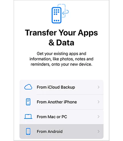 将联系人从 Android 设备转移到 iPhone 17(通过“转移到 iOS”功能):开始设置你的新 iPhone 17,直到出现“传输你的应用和数据”屏幕。然后选择“从 Android 设备传输”。