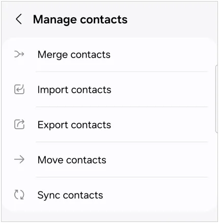 使用 VCF 将 Android 设备上的联系人共享到 iPhone 17:打开安卓手机上的“联系人”应用,点击“菜单”图标,选择“管理联系人”>“导出联系人”。然后将安卓联系人保存为VCF文件。