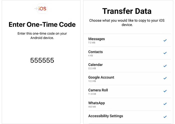 在安卓设备的“传输数据”屏幕上,选择“联系人”,然后点击“继续”。现在,等待两台设备上的传输进度条完成。