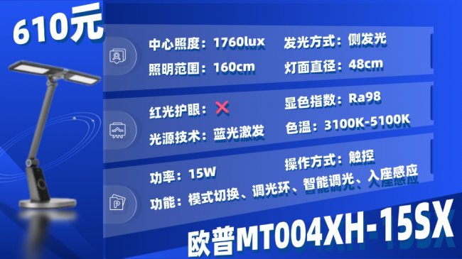 护眼设计方面:欧普MT004XH-15SX采用侧发光结合双翼灯头设计,光线可以均匀铺满大约160厘米的桌面,不会出现亮度集中或刺眼的情况。光源通过多层导光处理,整体光质柔和自然,文字边缘清晰。它的双翼旋转灯头能够上下翻转、多角度调节,即便光线直射也能轻松避开眼睛,配合3100K到5100K的色温范围,白天专注学习、夜晚轻松阅读都能找到合适光感。