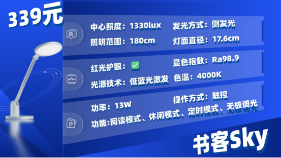 参数与使用体验方面:除了硬核护眼技术,书客Sky的使用体验同样出色,它支持多模式定时调节,可根据学习、阅读、休闲等不同场景快速切换,照明范围也能覆盖180cm桌面,确保即使是大尺寸书桌也可以获得均匀光照。而且它内置的OCLT光透镜可实现光线360度折射,减少书写时重影和眩光问题,写作业、绘画或阅读时光线稳定而舒适。是学习和长时间用眼场景中非常值得推荐的一款护眼台灯。