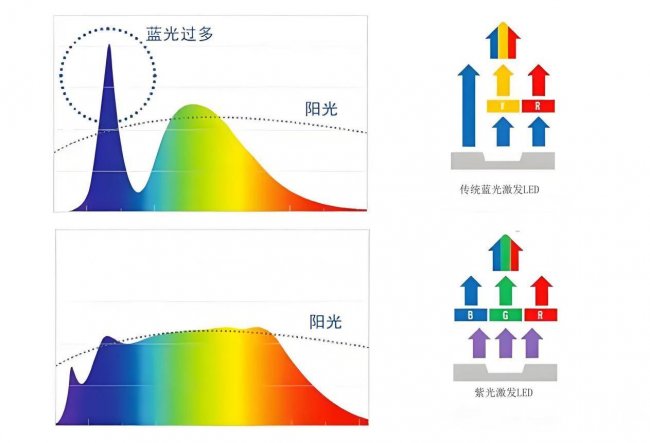 1、紫光激发一句话看懂:这是决定光线是否安全的基础。它是通过特定技术绕开了415–455nm波段的高能有害蓝光,从光源芯片层面就大幅降低了蓝光伤害的风险。