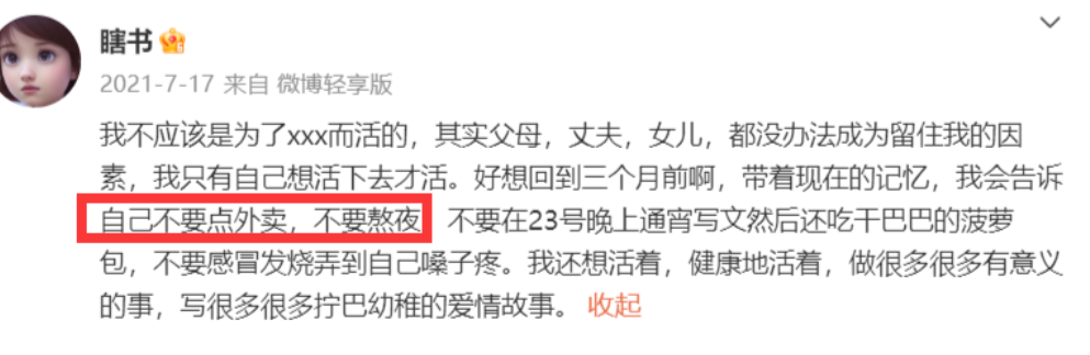 在瞎书的社交平台上,她表示,如果重新来过,会改变生活方式,不熬夜、不吃外卖,换一种健康的生活方式。
