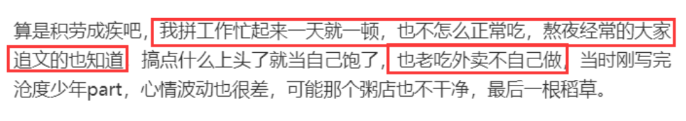 从瞎书的社交平台的文字可以找到她生病的蛛丝马迹,她生病之前通宵熬夜写文、吃外卖是生活的常态。有的时候即便是生病发烧,也会坚持更文。