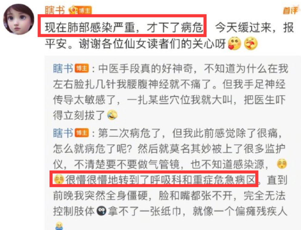 期间她时不时会更新状态,和书粉分享自己的病情。