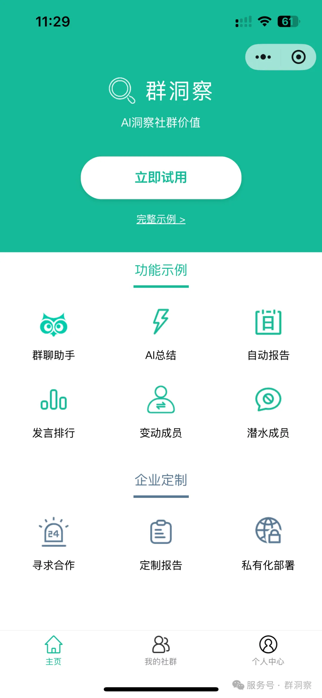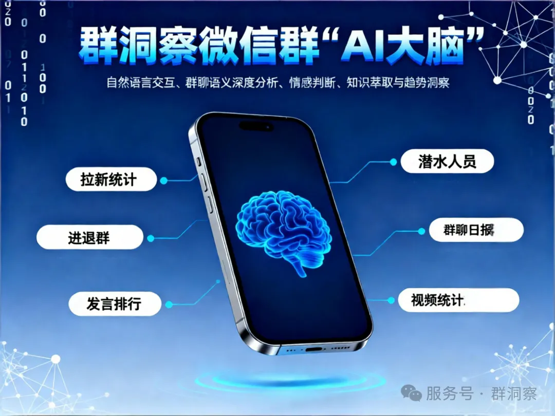以群洞察为代表。我们选择成为微信群“AI大脑”,核心能力在于:自然语言交互、群聊语义深度分析、情感判断、知识萃取与趋势洞察。它是一款轻量化AI,无需下载,在微信小程序就可以使用。