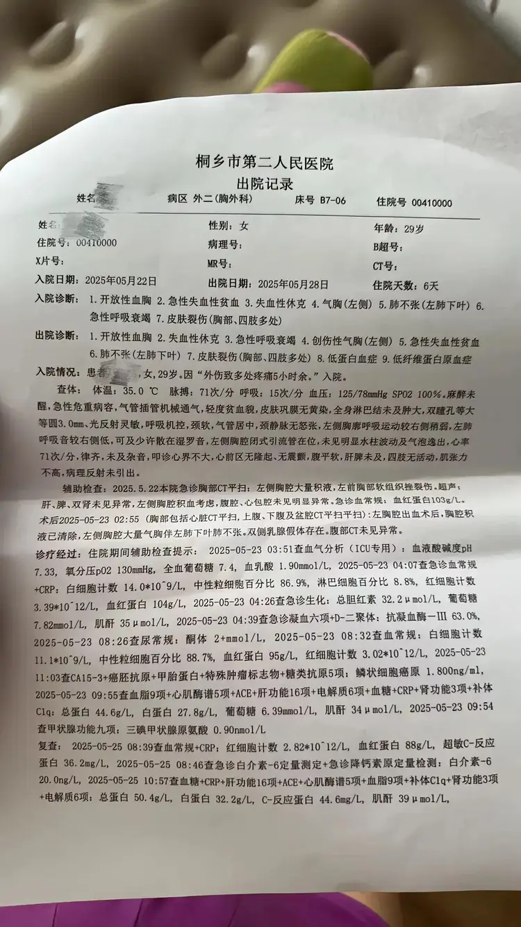 当警方抵达现场并要求嫌疑人下车时,局面突然失控。嫌疑人情绪激动,持刀连续捅刺马女士胸部及上半身,致其当场倒地昏迷。经医院诊断,马女士身中20余刀,其中多数刺击因胸部植入的硅胶假体缓冲而偏离要害,仅一刀穿透假体伤及右肺。这种现代医学技术与暴力伤害的意外碰撞,成为案件中最具戏剧性的转折点。