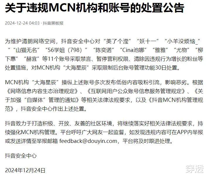 抖音宣布,对“56学姐(798)”等11个账号采取禁言、暂停营利权限、清除因违规行为增长的粉丝等处置措施,对MCN机构“大海星辰”采取限制后台账号管理功能30日处置。