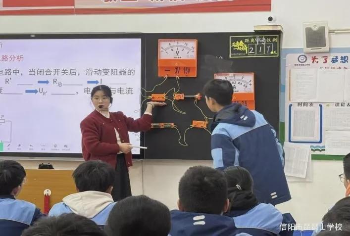 物理第二节示范课:由湖东分校刘红梅老师执教专题课《欧姆定律-动态电路分析》。刘老师以清晰的逻辑线与活跃的互动场,构筑了一节高效实用的复习课范例。课堂伊始,刘老师以“影响导体电阻的因素”精准设问,既温故知新,又迅速切入主题。在教学过程中,她注重让学生“在做中学”,引导学生亲手连接电路、移动滑片,亲眼观察电表示数变化,将抽象的“动态”过程化为具体可感的实操体验。