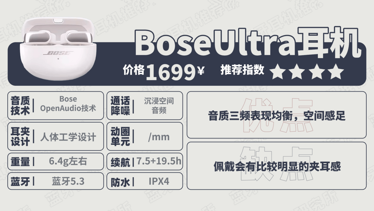 Bose Ultra,这款适合追求开放式体验又对音质要求高的小伙伴。音质方面,耳机搭载了Bose OpenAudio技术,三频的表现均衡且空间感十足,节奏感很强,整体的层次感很好。几乎什么类型的音乐都可以驾驭。佩戴上,耳机采用了人体工学设计,单只耳机的重量约6.5克,虽然重量不算轻,但耳机在设计结构上有所优化,采用了三点支撑的设计,耳机在佩戴时的贴合度和稳定性都表现不错,整体佩戴感还是比较舒适的。续航上,bose ultra单只耳机可连续使用7个半小时,搭配充电仓可使用20个小时。综合来看,bose这款耳机价格较高,但是综合体验不错,预算充足的用户这款也可以考虑。