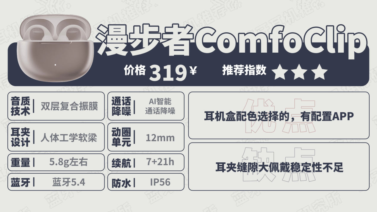 漫步者comfo clip,这款耳机在佩戴设计上采用了空气弧人体工学软梁设计,单只耳机重量约5.8克,佩戴时不会有明显负担感。不过它的耳夹缝隙稍大,运动时容易松脱,尤其是跑步或者剧烈运动,掉落风险较高,所以更适合静态场合,比如办公、通勤或者在家使用。音质上,耳机内置了12毫米的单元振膜,整体音质表现一般,声音还原度比较低,音质像糊上了一层雾的感觉,低音下潜也不足。耳机的防水性能还不错,具有IP56的防水等级,日常的汗水和小雨完全没问题,不用担心耳机因进水而损坏。