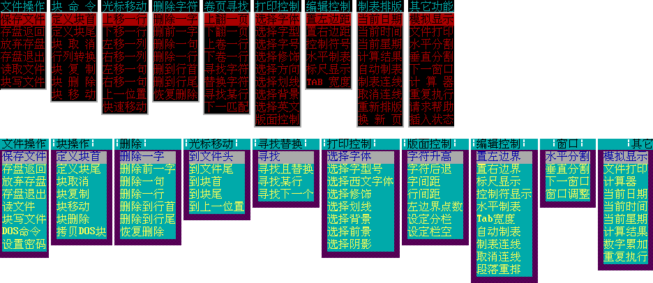 WPS for DOS 1.2(上)和2.3(下)的菜单项对比。