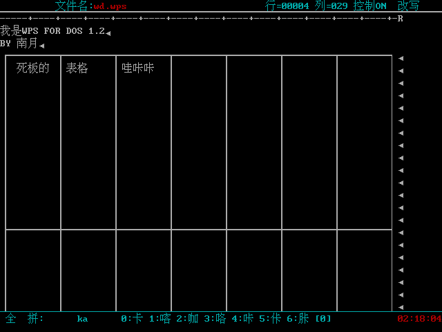 ▲整个DOS版的WPS都不支持所见即所得,表格也是用制表符敲上去的,当然WPS本身提供了简单的自动生成表格的功能,也可以手动敲制表符。