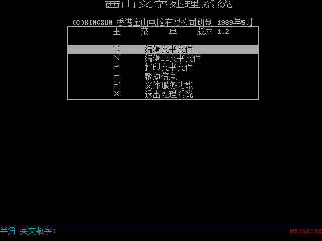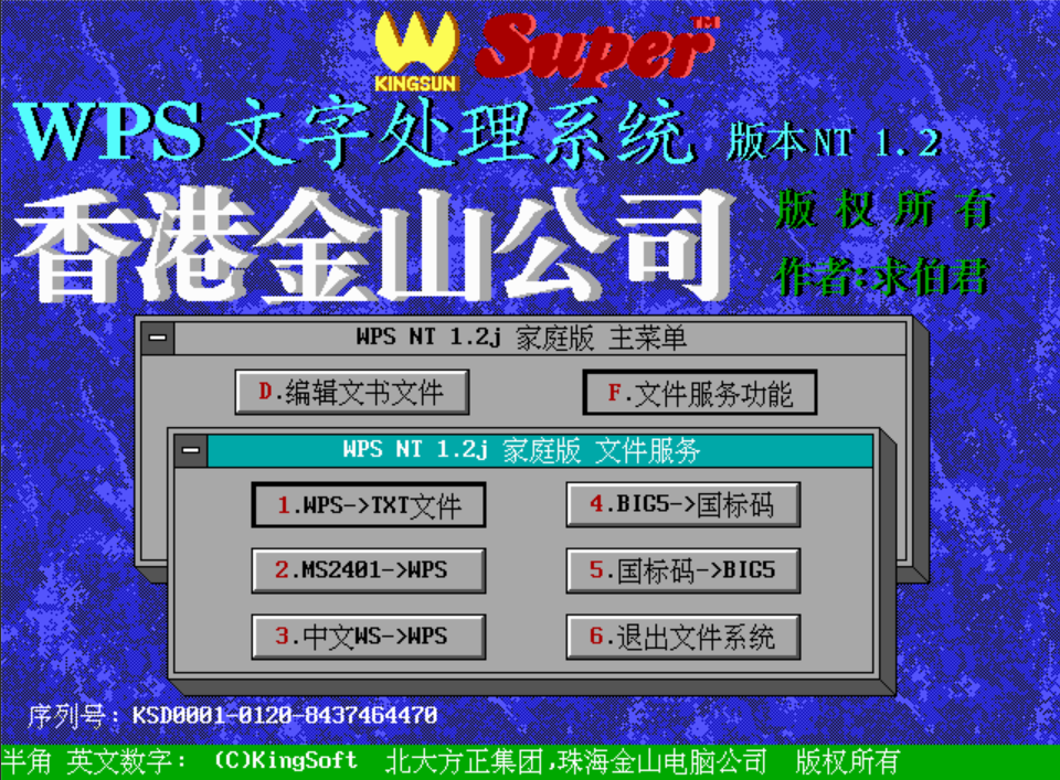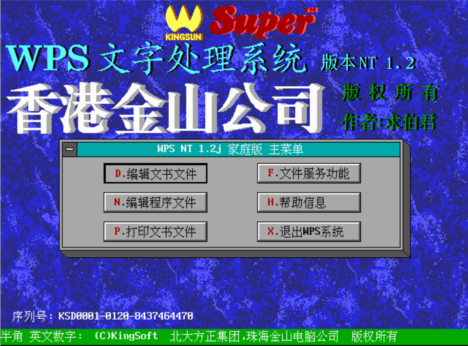 ▲1.0时代的WPS是最简单的,连Logo都没有,就一个大字号的标题、公司名,以及一个菜单,支持快捷键。演示版本为WPS for DOS 1.2。