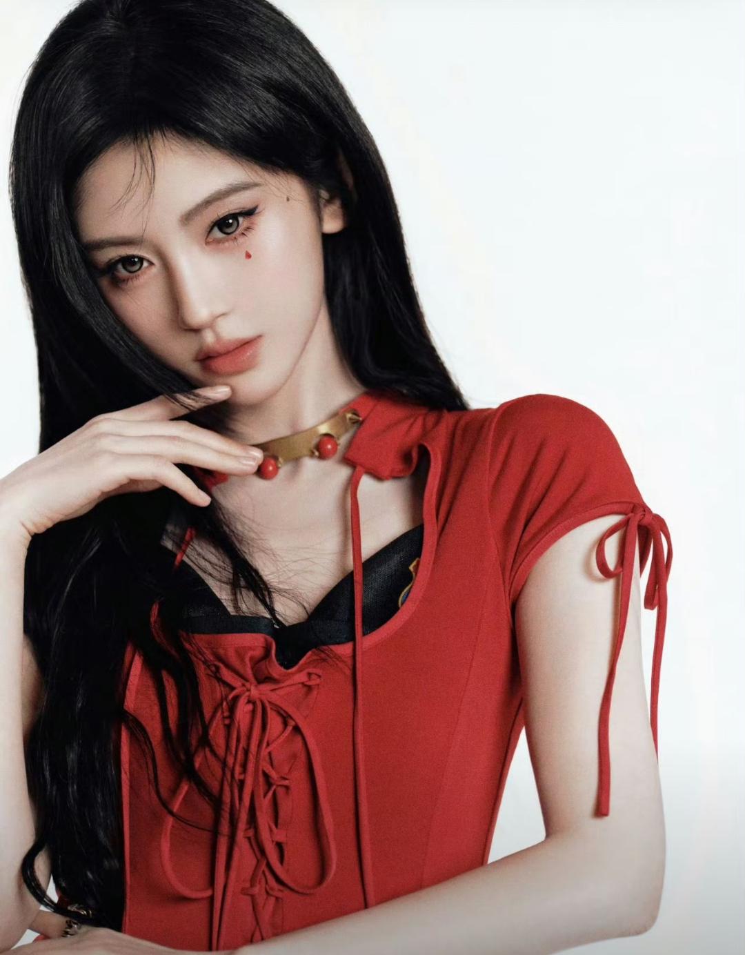 先瞧瞧这让人一眼万年的妆容,鞠婧祎简直就是“红运辣妹妆”的“行走代言人”。眼妆部分,那红色系眼影晕染得那叫一个绝,恰到好处地勾勒出深邃又魅惑的眼眸,仿佛藏着无数小秘密,再配上那又长又翘、根根分明的睫毛,就像小刷子一样“扑闪扑闪”的,每一次眨眼都像是在“发射爱心电波”,让人瞬间被“电”得晕头转向。腮红更是点睛之笔,红扑扑的,就像春天里盛开的桃花,可爱中又透着一丝小性感,妥妥的“纯欲天花板”,让人忍不住感叹:“这哪是化妆,分明是在脸上作画啊!”