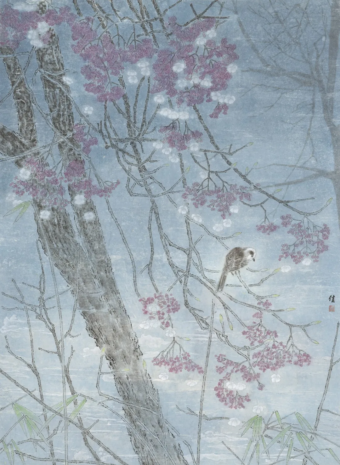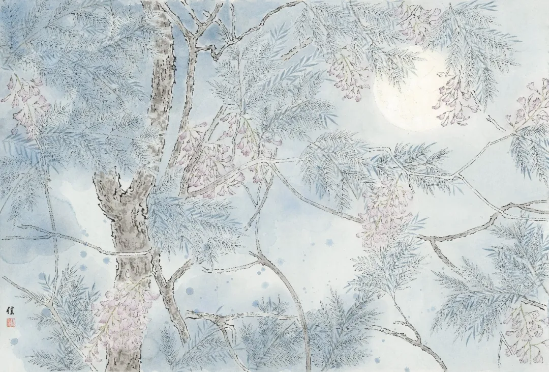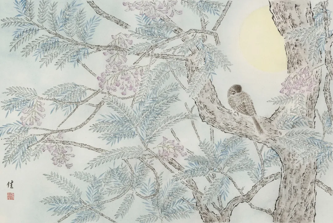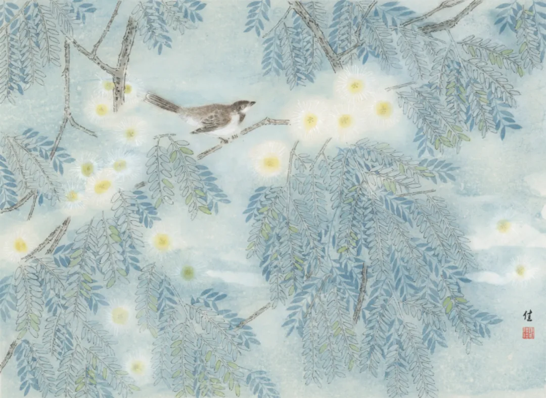 在创作中,我始终追求“以形写神”,在工笔的精致框架下,让每一根线条、每一块色彩都服务于情感的表达。雪景系列在清寂的底色中透出生命的力量,春景则在明媚的色调里舒展自然的生机,让传统工笔的典雅与当代人的精神共鸣相互交融。我相信,真正的美并非源于外界的喧嚣与追逐,而是在静观万物时,内心与世界达成的和解与自足。
