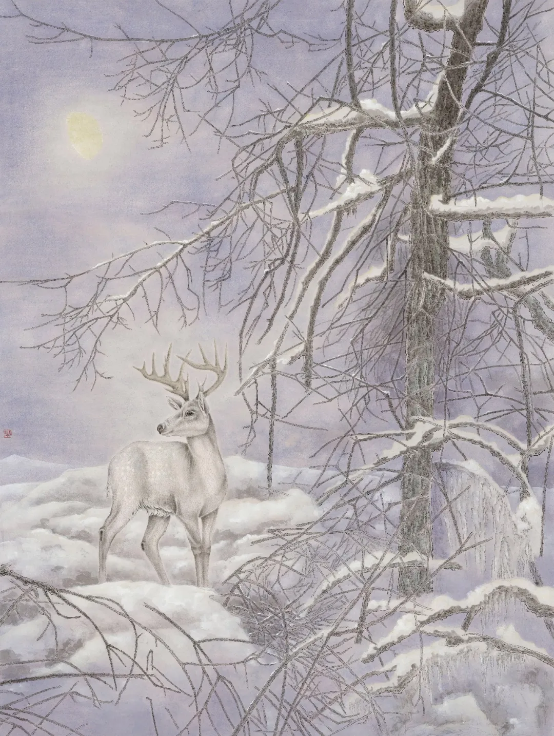 我近期的工笔创作,以“生灵与四时”为核心,在传统工笔的严谨法度中,注入当代审美与人文关怀。作品聚焦于自然中最具诗意的瞬间:雪枝上静栖的雀鸟、月下回眸的灵鹿、花影间轻啼的生灵,它们既是东方美学中“天人合一”的诗意载体,也是我对生命韧性与自然之美的深情凝视。