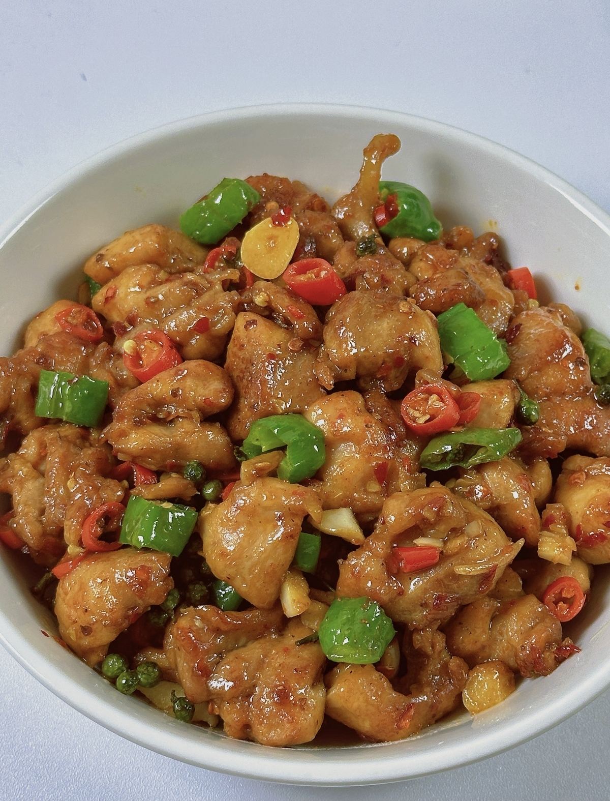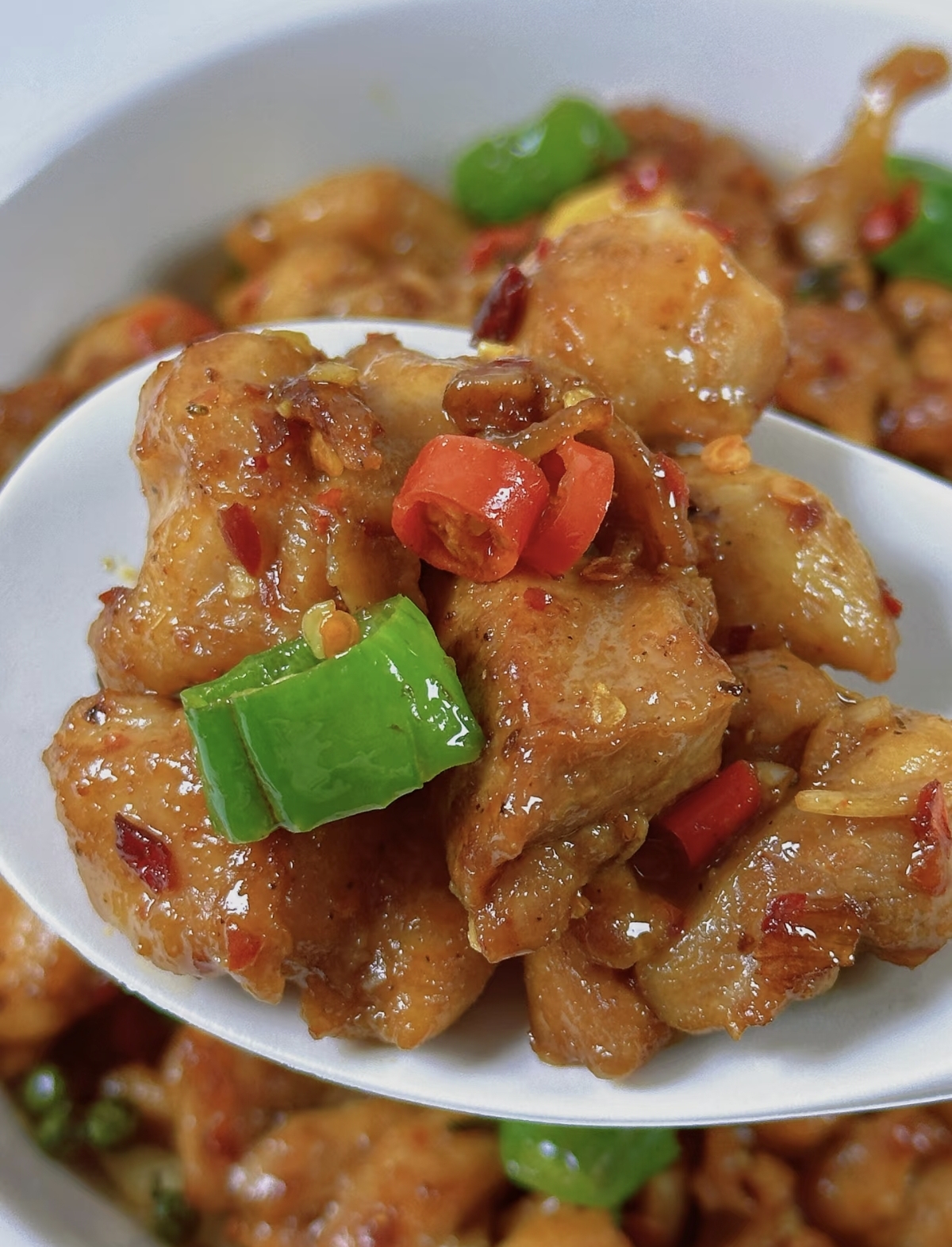 随后,从锅边淋入少许花雕酒,瞬间激发出浓郁的香气。加入少许清水,调入适量的盐、鸡精和一点点白糖提鲜,大火烧制约8分钟,让鸡肉充分吸收汤汁的味道。最后,放入之前准备好的芹菜段、大葱段和青线椒,快速翻炒均匀,待蔬菜断生后,淋入少许香油和麻油,翻炒两下即可出锅装盘。