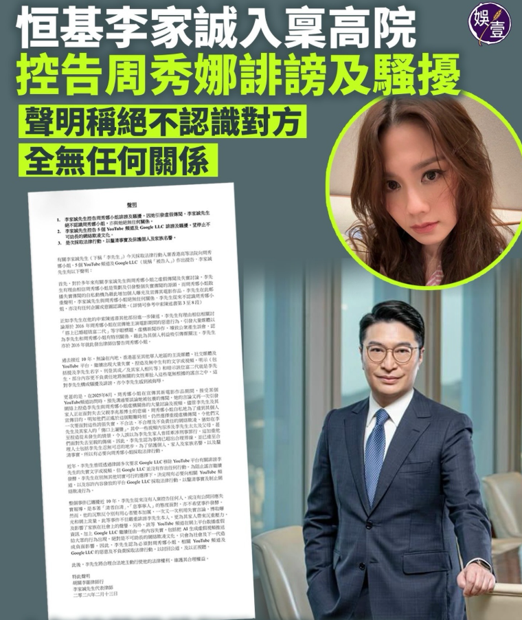 2026年2月13日:李家诚亮剑,告周秀娜+5个YouTube频道+Google!终于,李家诚忍不了了!他带着律师团杀到法院,控告周秀娜诽谤+骚扰,连5个YouTube频道和Google都一起告了——理由是“平台纵容AI生成虚假视频,像野草一样疯长!”