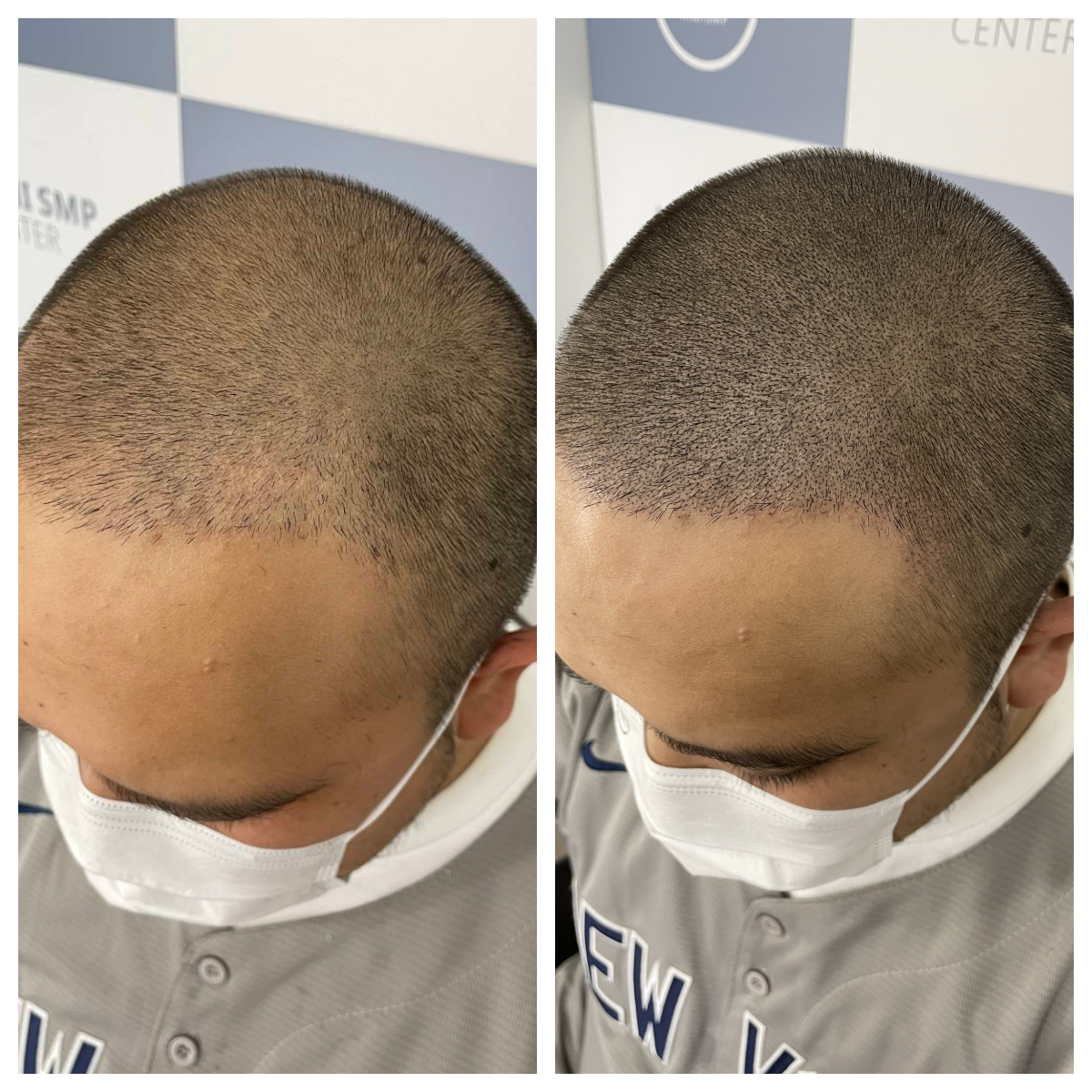 很多人第一眼都问:“这是植发吗?”不,这是纹发——用微色素精准植入头皮,模拟真实毛囊的密度和分布。你看这发际线,从眉心到头顶,过渡得自然又柔和,完全没有生硬的“假发感”。让我觉得神奇的是,它能根据你的原生发色调整色调,我的原生发色被完美的还原,连发旋的走向都和真头发一模一样!