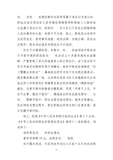 为维护自身合法权益,刘先生就该行政拘留处罚提起行政诉讼:2025年2月26日,修武县人民法院一审判决驳回其诉讼请求;2025年6月13日,焦作市中级人民法院驳回其上诉,维持原判;2026年1月26日,河南省高级人民法院驳回其再审申请。刘先生认为,相关司法裁判未全面查清案件事实,其发布视频的初衷是督促相关部门依法履职,并非违法违规行为,其将持续通过合法途径维权。