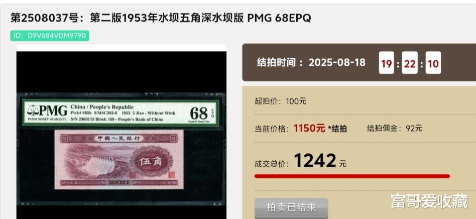 在2025年8月18日的“现代钱币拍卖会”中,一张PMG评级68分(带EPQ)的“深水坝5角”,最后拍出了1242元。