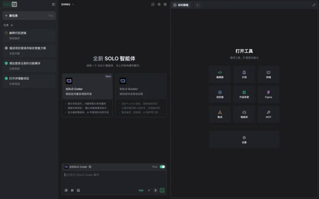 SOLO 正式版引入了真正的多任务并行(Multi-Tasking)。开发者可以同时开启多个项目或子任务,并根据需要随时切换。每个任务的上下文都会被完整保存,不会因为来回切换而丢失信息,开发节奏也因此更加流畅。