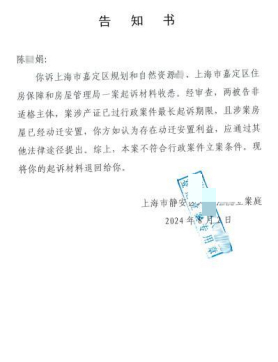 2024年8月,陈某娟以嘉定区规资部门、房管部门为被告再次起诉,又被法院以被告不适格、超过最长起诉期限且动迁安置已完毕为由退回材料。