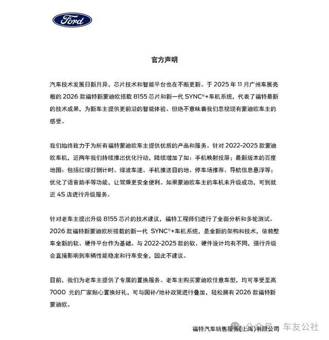 长安福特近日就蒙迪欧车机争议发布的声明,主要回应三点:一是2026款新蒙迪欧搭载的8155芯片与新一代SYNC®+系统,是面向新车主的技术升级;二是已为2022-2025款老车主优化车机,新增手机映射、新版百度地图等功能,未升级车主可去4S店办理;三是明确不建议老车主升级8155芯片,称新旧车型软硬件架构差异大,强行升级影响安全,同时推出至高7000元置换补贴,鼓励老车主换购新车。