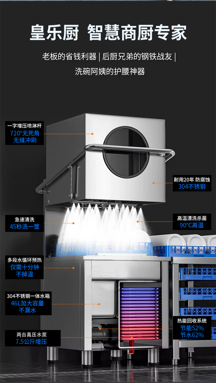 皇乐厨揭盖式商用洗碗机——专为餐饮后厨打造的高效清洁解决方案,洗得快、洗得净、省人工、更省钱,让您的后厨洗碗问题一扫而空!
