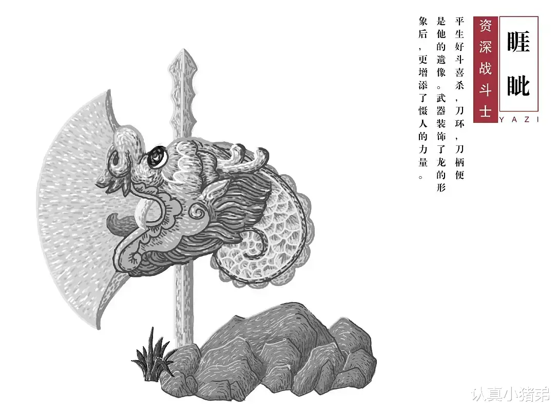 我们经常可以在武器上看到有龙的存在,那就是睚眦,人们根据睚眦的这个性格特点,希望他为武器附魔,让武器更加威武的同时让对手胆颤。