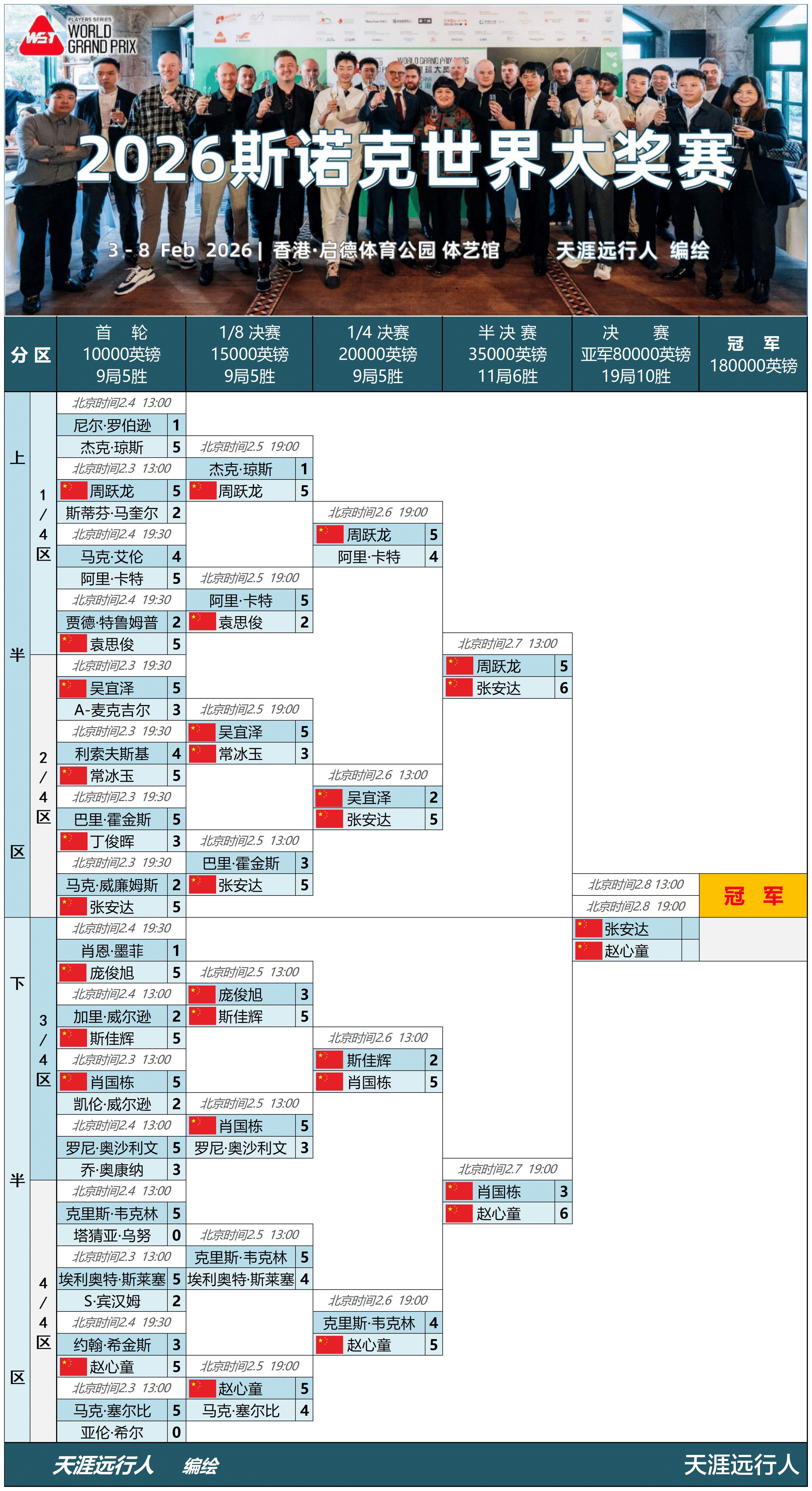 最新即时更新2026斯诺克世界大奖赛进程签表,一表看世界大奖赛全程,各位看官老师敬请转发收藏,以备不时之需