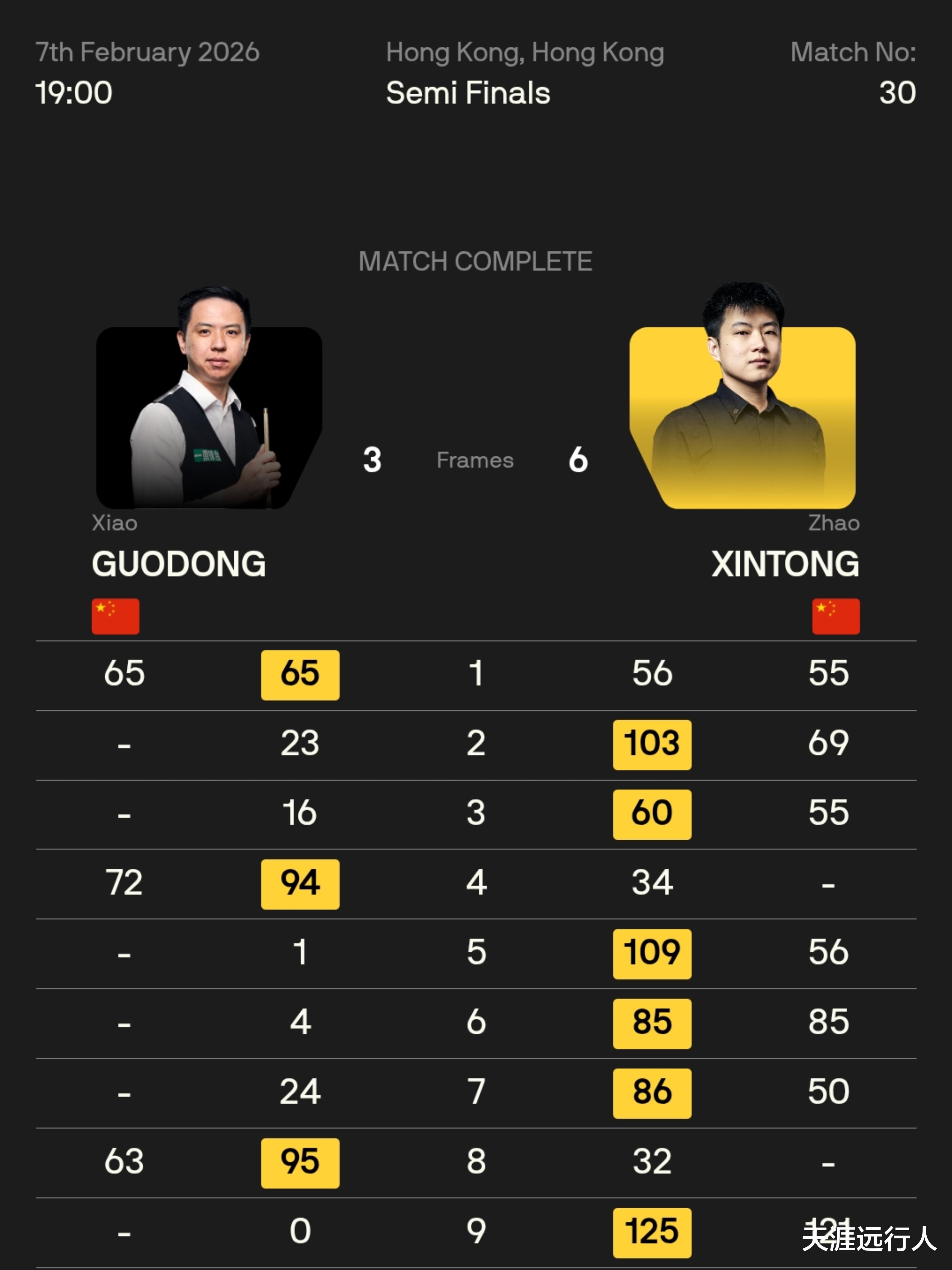本场比赛,赵心童打出一杆121分破百和55、69、55、56、85、50分六杆50+,肖国栋打出65、72、63分三杆50+。