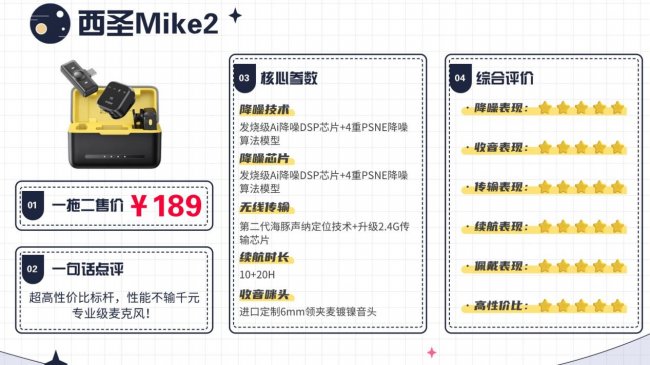西圣Mike2麦克风将节省的广告费用全部投入技术研发,配备高品质进口定制6mm领夹麦镀镍音头、32位浮点数计算DSP和4重PSNE降噪算法模型,极大地提升了麦克风的抗噪能力和声音还原度。还通过了150多项高品质测试标准,远超行业常见的5-10项检测,续航30小时,6年内性能衰减度低于0.1%,性价比相当高。