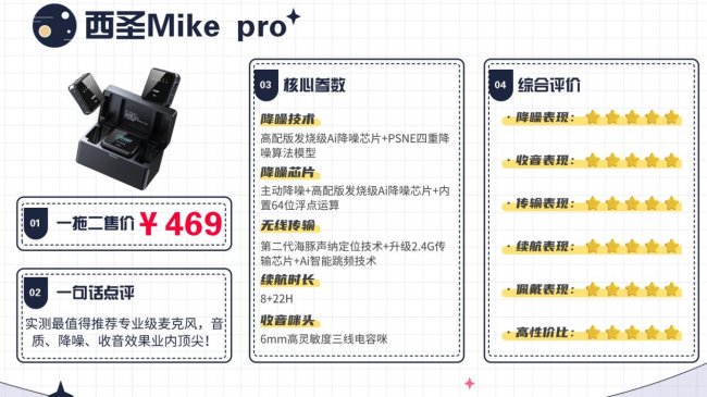 特别值得一提的是,西圣Mike Pro凭借卓越的收音效果和稳定的信号传输,自面市以来在众多音频设备推荐榜单中名列前茅。据了解,西圣是较早致力于音频技术研发的品牌,有着深厚的技术积累,在无线麦克风技术实力方面的优势不言而喻。