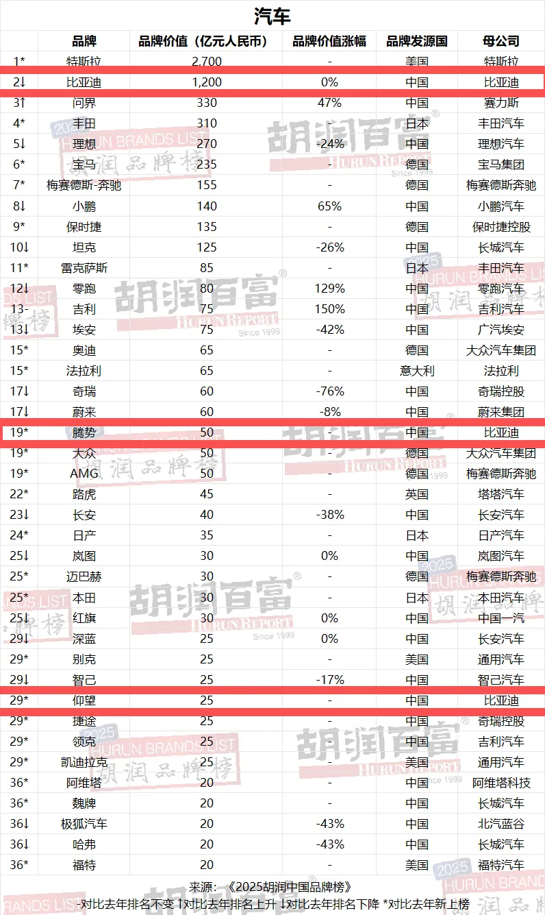 作为中国最早涉足电动汽车领域的企业之一,比亚迪领跑中国品牌价值,旗下腾势以50亿元、仰望以25亿元的品牌价值首次上榜,进入全球汽车行业品牌序列。