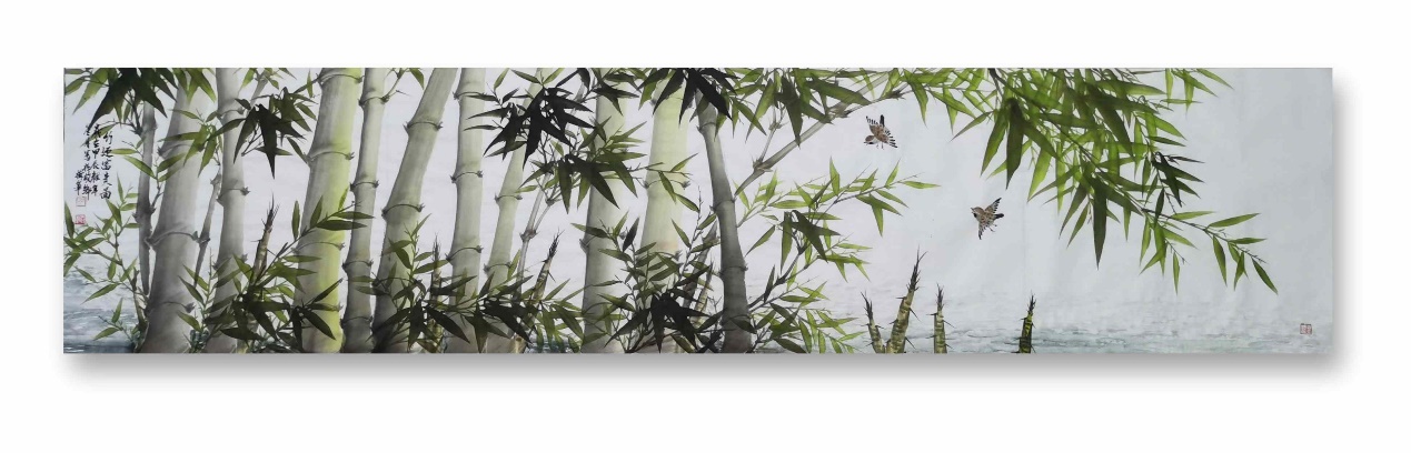 其画竹技法,是可见郑板桥先贤之功底,又有王相文先生之授业。由此笔墨间的运思挥毫,无论是取象着意,还是随类赋彩,都是能达到一种“理法相生,气机流畅”的境地。笔腹蘸水涩进,使竹干至若磔髦竦骨,粗壮之根,矗立画端。笔毫着色出锋,则使叶片平易流畅,一笔一画间从不拖泥带水,或宜隐藏,或宜显露,正是各得其宜!诚然,业内画竹者众多,却为何出彩者少见,其根源也就是在于一句话,即画其形易,而画其精神则难!所谓画形者,无非临摹搬照,仅徒貌似,而如宫树军先生这般画家,却是能将画外妙意尽赋其中,以竹为源,画其心哉!故一幅之中,往往都是能透露出一股清雅之气、一种谦谦之风。此正如古人所言,是谓画有尽而意无尽!