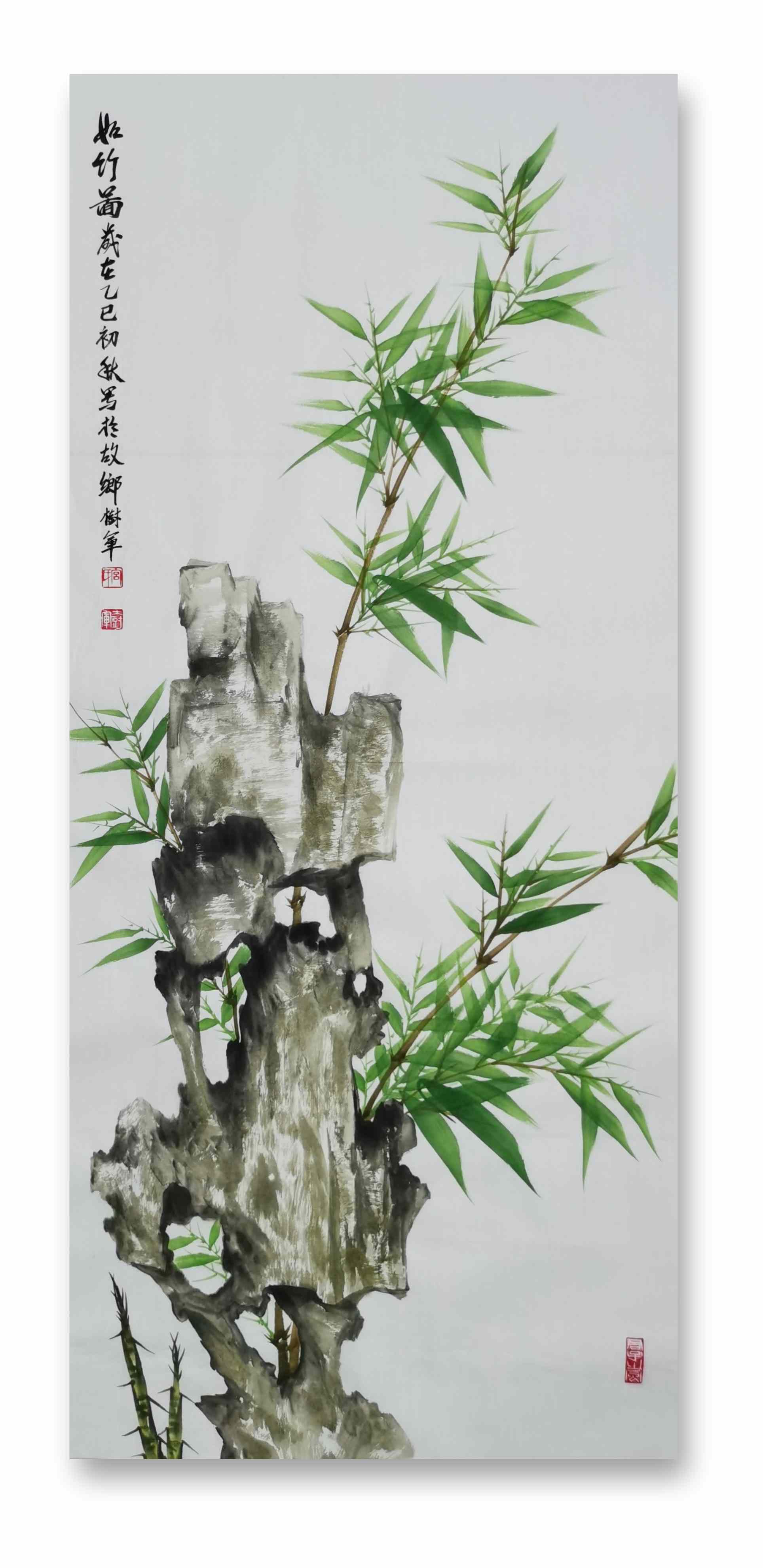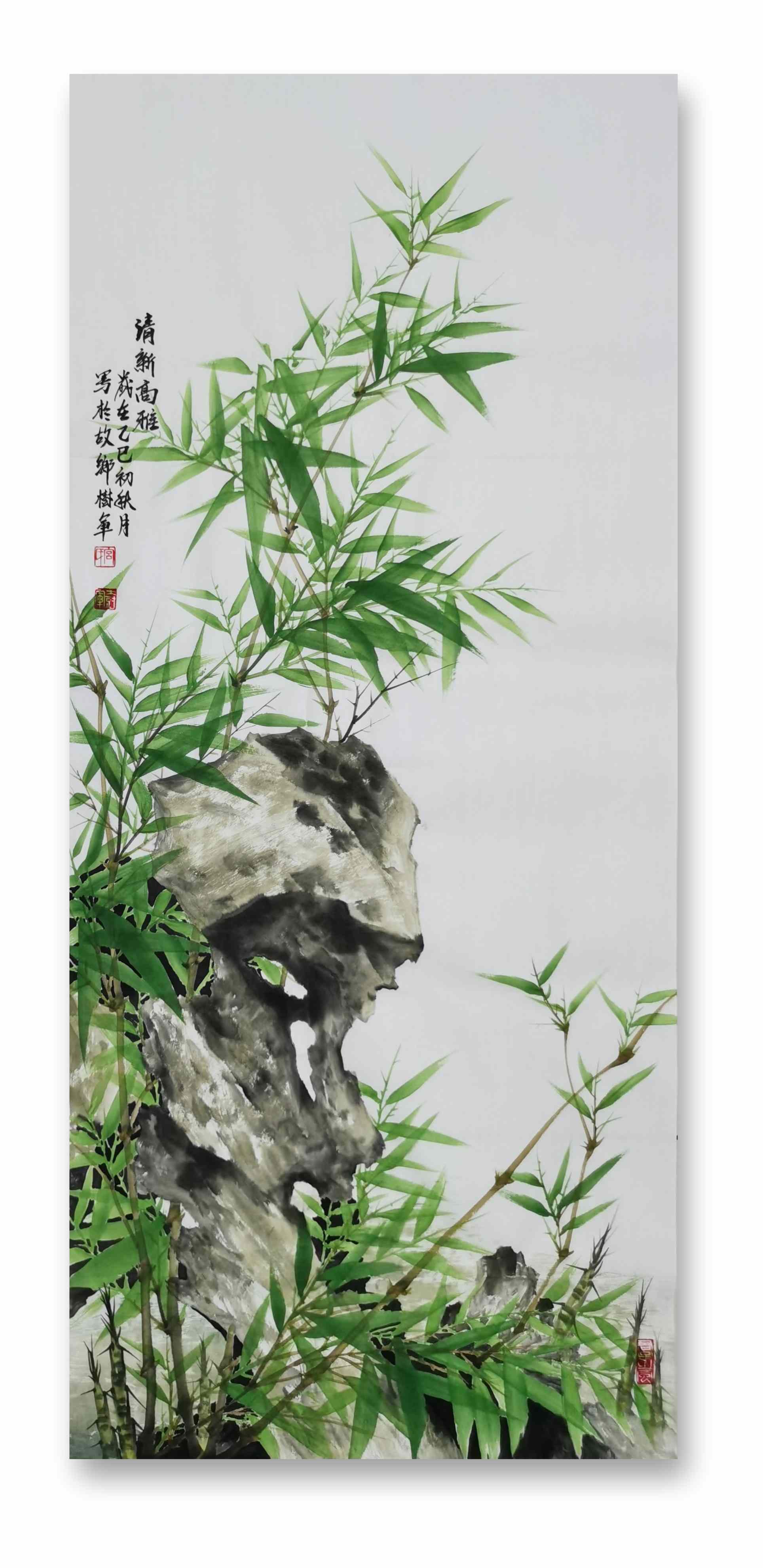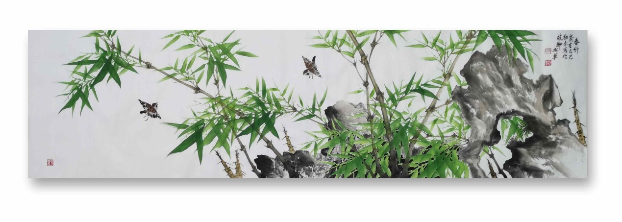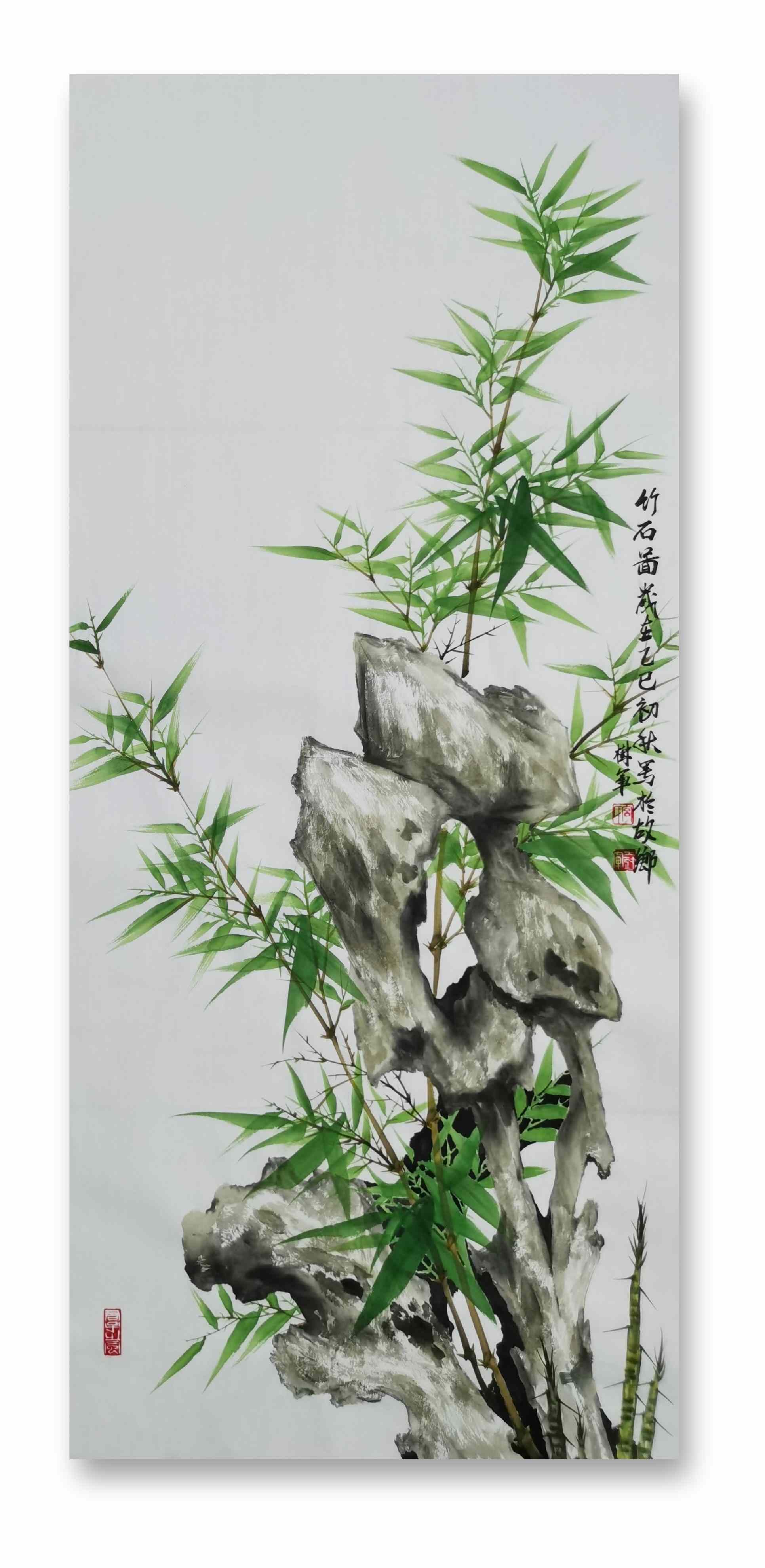 单看他的一幅《竹朋石友图》作品,画中宫树军先生精心布局,是以奇石衬托绿竹风姿,更是以绿竹照应奇石根基,二者之间,单看一者就足以成画,合起来便就更是相辅相成,极具于诗情妙韵!另一幅《清风明月图》中,则是两竿绿竹悠然斜出画面,竹叶间洋溢着清新淡雅的生机,枝叶交错,仿佛有月光穿透其间,洒落点点银辉。乌云月下照翠竹,画意清幽畅心神,可以说,正是凭借着这种凝神遐想、妙悟自然的写意情怀,宫树军先生的竹画作品才会在当代画坛内独树一帜,并最终给人留下了一种深刻而独特的艺术印象!