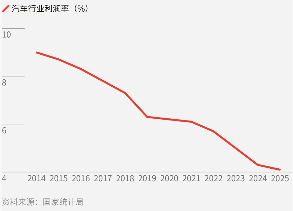 按照国家统计局的数据,汽车行业利润率为4.1%,比2024年低了0.2个百分点,2025年12月,一度仅为1.8%。