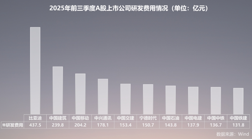 我们可以看下面这张图,2025年前三季度,在国内所有上市公司中,比亚迪投入的研发费用是最高的。