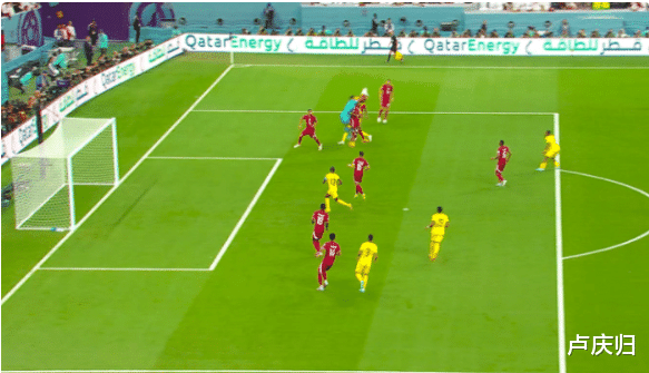 这之后我通过社交媒体看到了一些裁判员老师的相关账号发布的信息,博主“裁判圈”提出了一张静止画面,在俯瞰图中可以清晰看到在卡塔尔门将出击的一瞬间有一位厄瓜多尔球员与其争抢同一个落点,而他们二人身后还有一个厄瓜多尔球员,正是这个后点球员因为伸出了一只脚导致比卡塔尔倒数第二名球员更加靠近于底线,因此被VAR识别为越位,这与半自动识别系统给出的越位人员是完美对号的。
