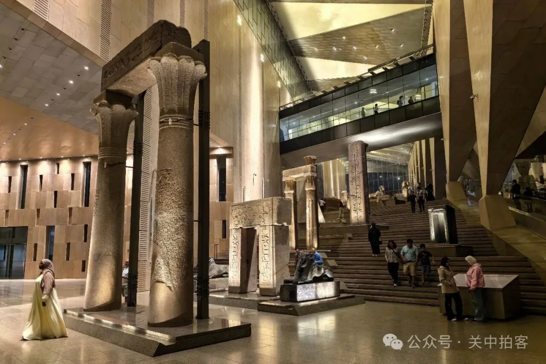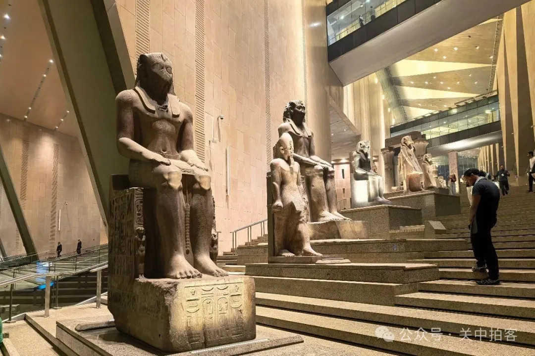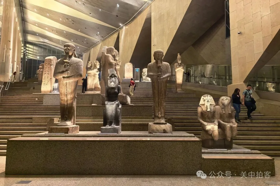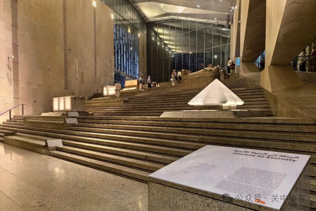 2025年11月22日上午,我来到大埃及博物馆,大楼梯上的人特别多,便先参观上方的展厅。夜晚,临近闭馆的时候,大楼梯上的人明显少了!于是,我乘坐电梯到达大楼梯顶端,再自上而下欣赏每一件石刻,包括59件大型雕像、碑刻、立柱、棺椁等。